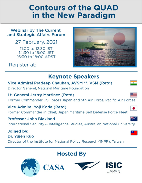 CASA and ISIC, Japan are holding a Webinar on the contours of QUAD in the New Paradigm. The details are as under. I will post further details shortly. I will be moderating the discussion.